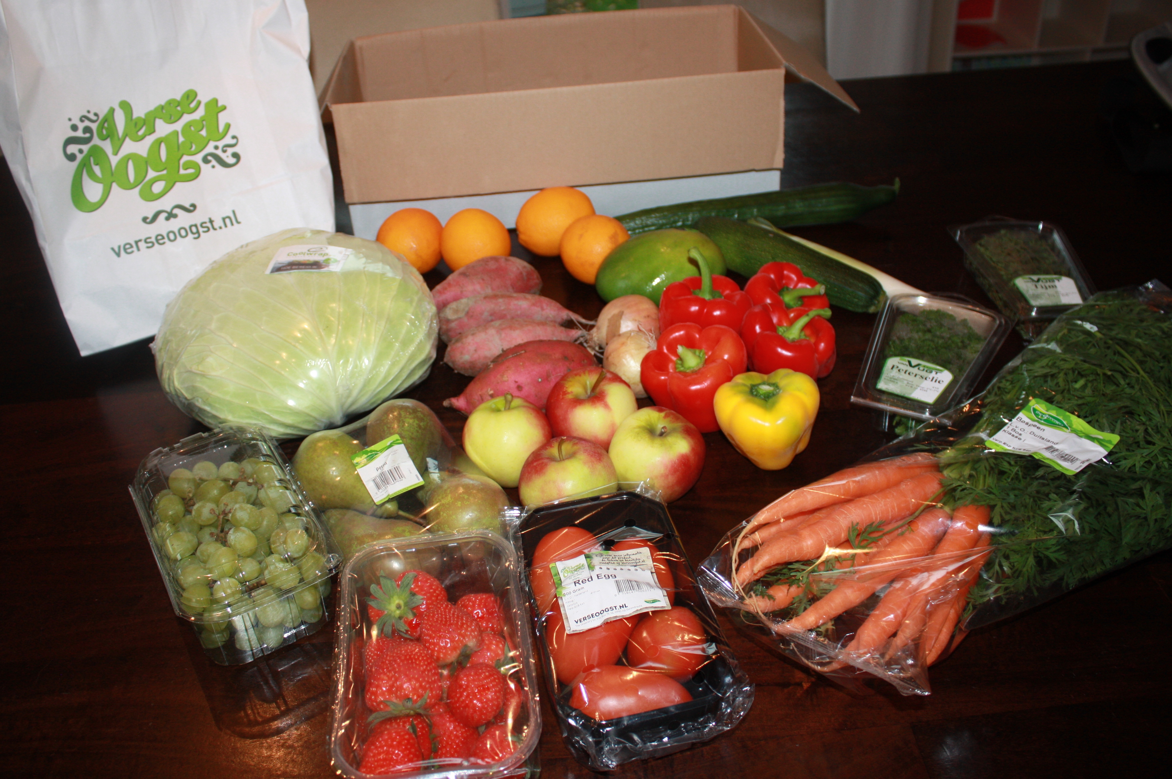 Een mooie variatie aan verse groenten en fruit, Het ziet er allemaal heel goed uit. Gek genoeg had ik alleen de verwachting dat de producten bij mij uit de buurt zouden komen. Ik weet niet meer waarom die indruk bij mij werd gewekt,misschien omdat ze zeiden dat ze op maandag zouden gaan oogsten. Hoe dan ook de indruk was gewekt daarom heb ik toch wat moeite met mango uit Brazilië, maandag geplukt en meteen met het vliegtuig mee? Sinaasappels uit Spanje? En nog wat groenten uit Duitsland.