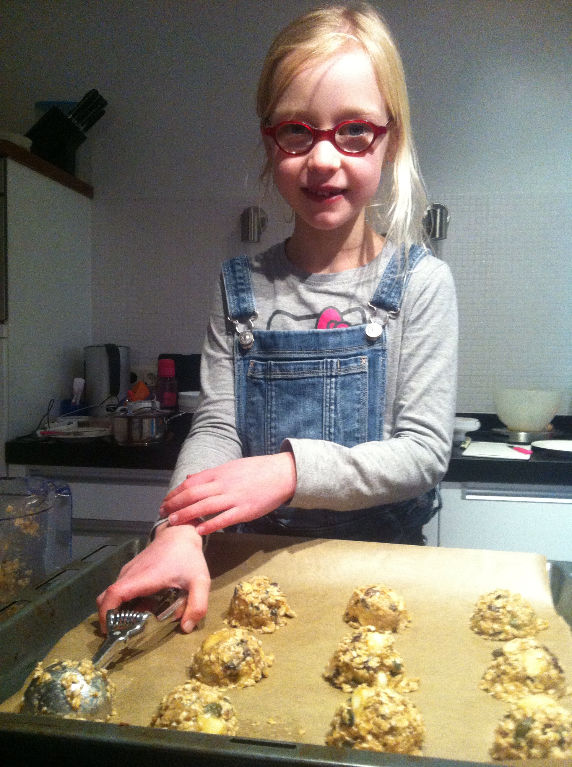 Een wat rimpelige appel ligt naast de fruitschaal. Ik weet dat hij waarschijnlijk grotendeels in de schooltas mee terug komt als ik hem meegeef als 10-uurtje. ‘Hij is oud!’Des te groter mijn verbazing toen Anne voorstelde om hem dan maar in koekjes mee te bakken. En dat werden hele lekkere koekjes.